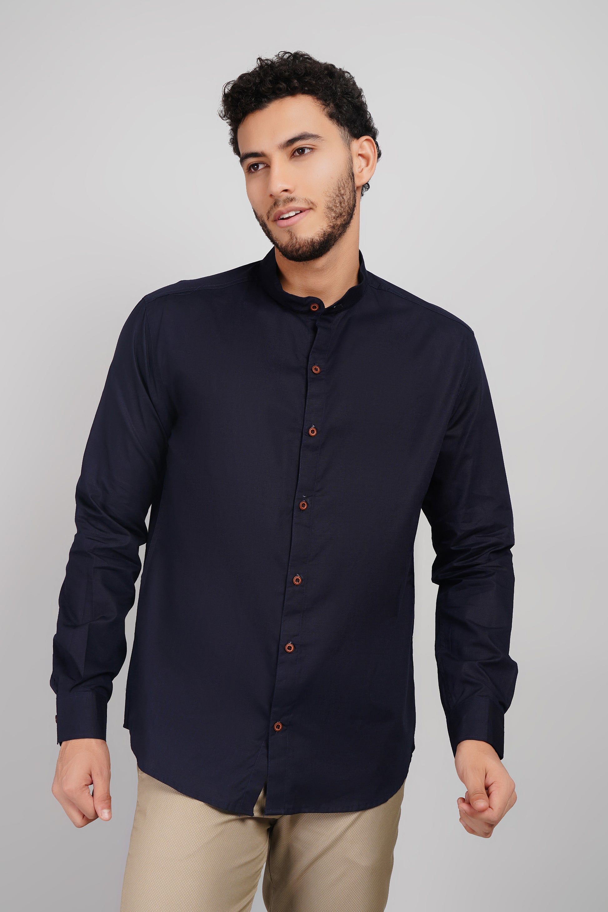 Elevate your formal wardrobe with this Rarerz navy linen cotton, mandarin collar shirt with wooden buttons, crafted from premium linen and cotton blend for all-day comfort. The classic fit pairs effortlessly with tailored trousers for a sophisticated look, making it ideal for office wear or formal events. Featuring full sleeves, this shirt adds a touch of elegance to any ensemble. Experience refined style and unmatched quality in every detail. Ideal for the modern man who values sophistication.