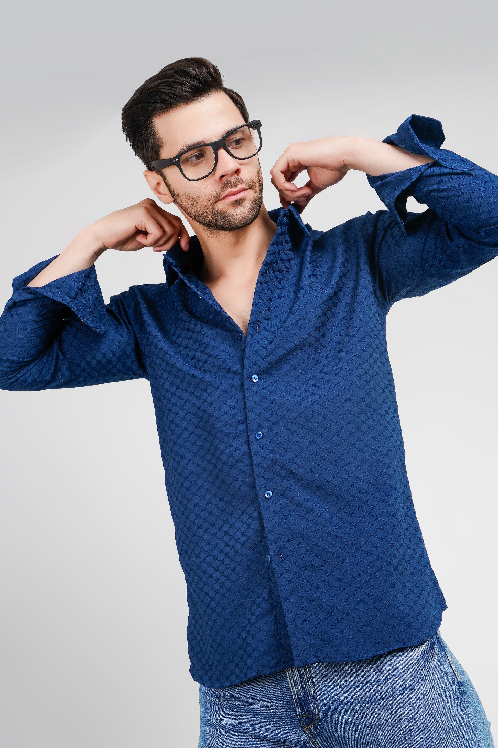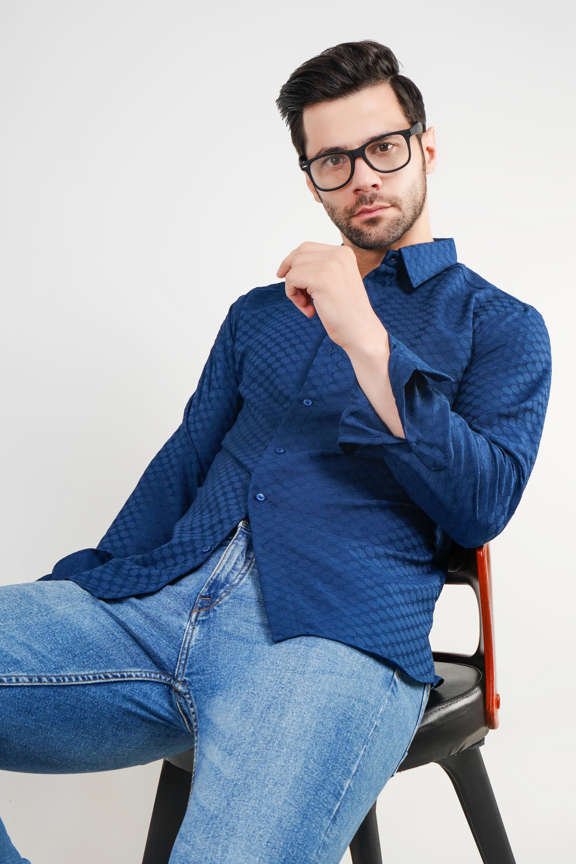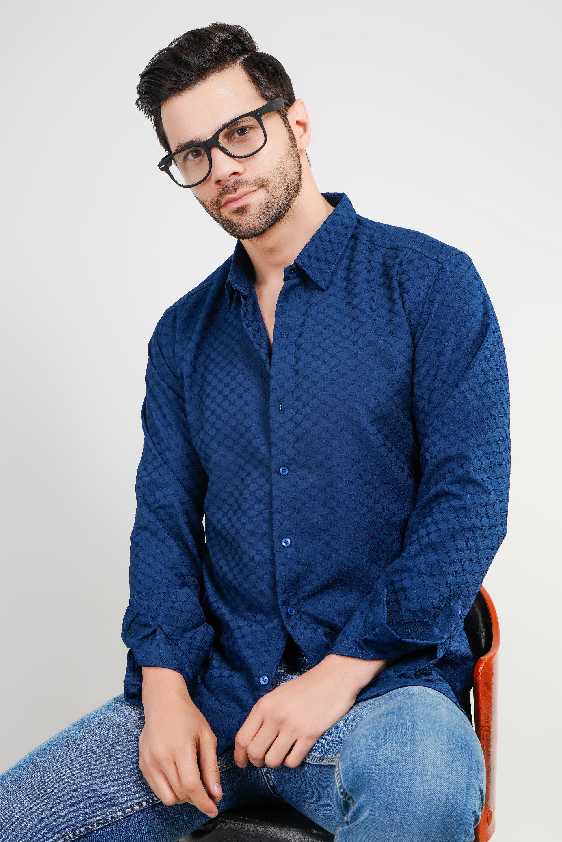 Elevate your wardrobe with the Oxford Blue Jacquard Shirt, a perfect blend of style and comfort. Crafted from premium Jacquard fabric, this full-sleeve shirt features a subtle yet sophisticated textured pattern that adds depth and elegance to your look. The rich oxford blue color offers versatility, making it ideal for both formal and casual occasions.